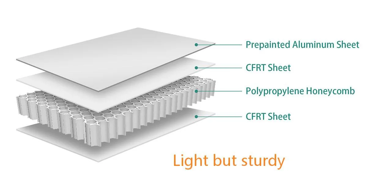 ●راه حل لانه زنبوری: بسیار سبک وزن. پانل های کامپوزیت ما مقاومتی برابر یا بیشتر از فولاد دارند در حالی که وزن بدن را بین 30 تا 50 درصد کاهش می دهد.